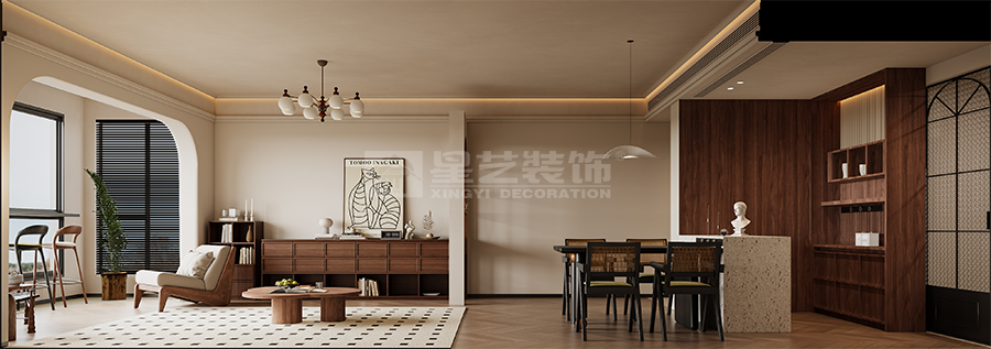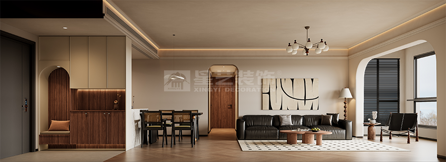 业主为:材料商南方布艺风老板, 自己有装修材料和施工队的,但是依然坚定的选择了星艺,是对行业标杆的肯定和自住项目的高要求,还有对设计格调的追求 业主两夫妻和二岁女儿,喜欢中古风,松弛而不失精致的感觉,喜欢在休闲的午后,光脚踩在木地板和窝在沙发的感觉,对材料和软装的品质,有较高的要求,尤其对灯光和层高有要求,本案采用悬浮式免吊顶带灯型材,实现了悬浮顶的灯光效果,搭配俯瞰江景的提升窗吧台,业主喜欢西式的设计,但是也遵循传统风水,做了隔断的设计,整体风格感突出,