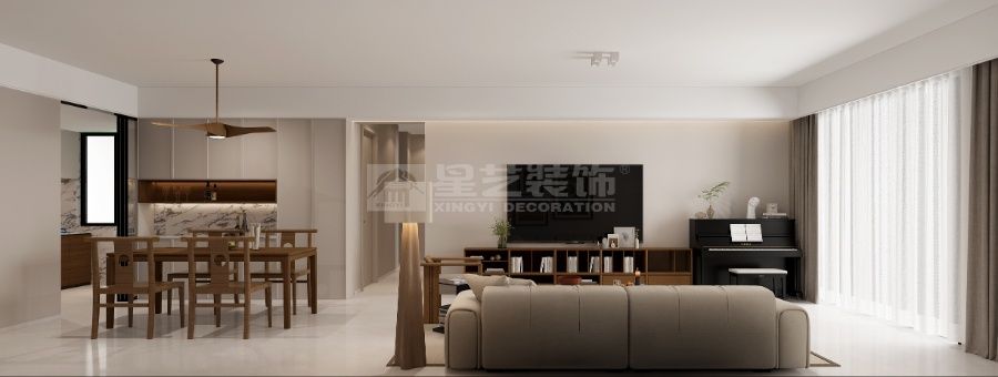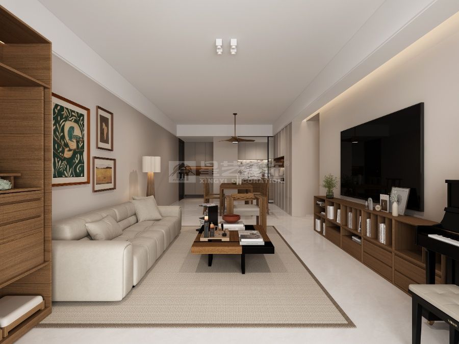 以暖木色与浅白为基底,打通餐厨客域,借收纳柜体与艺术软装柔化空间,融实用与雅致,营造松弛的轻居氛围。