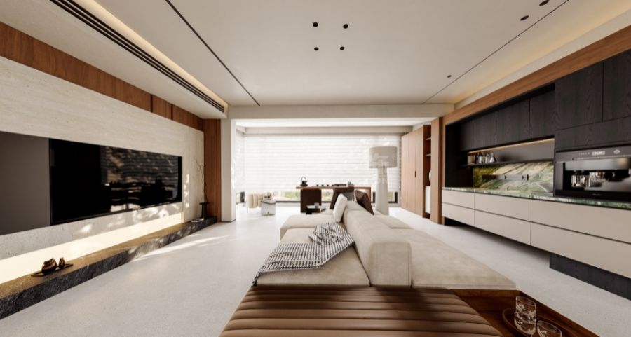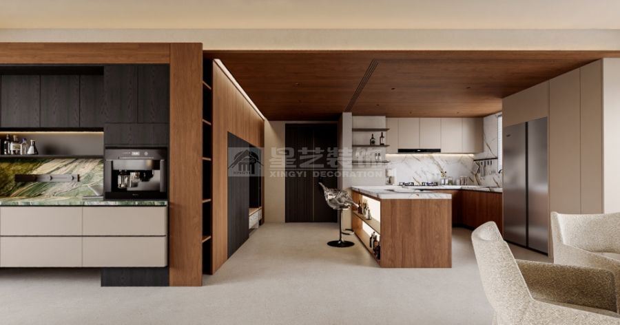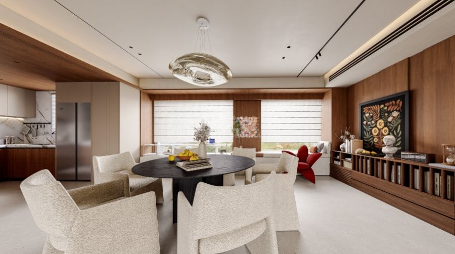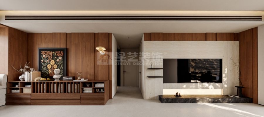 本案以中古风为魂,深色调为骨。莱姆石地面沉淀时间纹理,洞石墙体流淌自然韵律,温润木饰面包裹空间,共同构筑沉静而富有故事感的栖居意境。