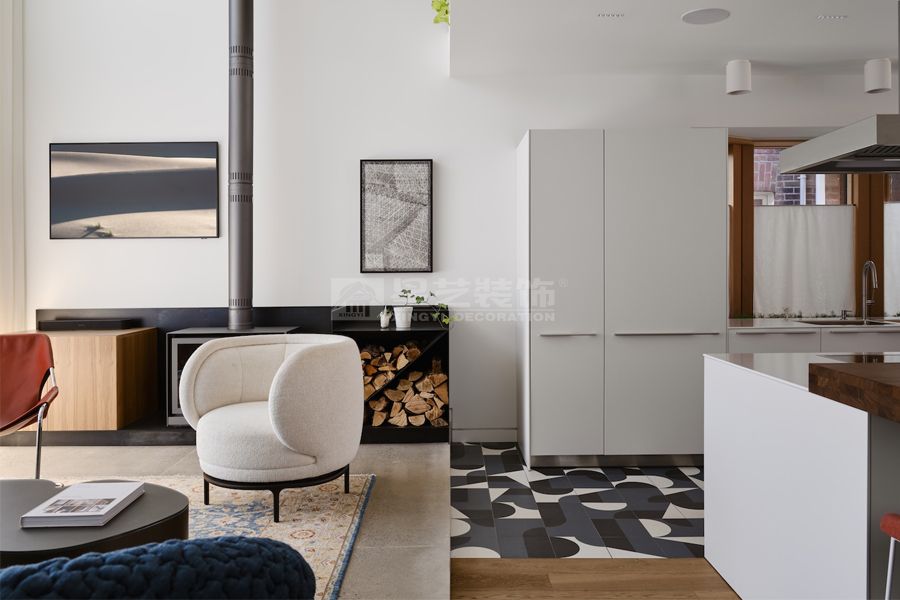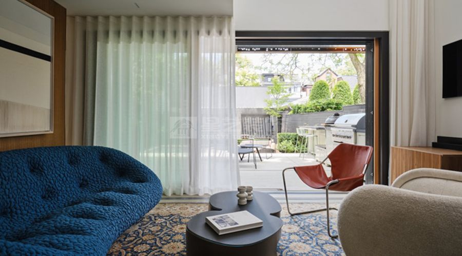 以「室内外空间交融」为核心,用曲线感的蓝色模块沙发打破直线条的冷峻,柔质纱帘模糊室内外界限,复古花纹地毯与现代金属家具碰撞,将自然绿意引入居住空间,在简约的硬装基底上,营造出松弛且有层次的生活栖居角落。