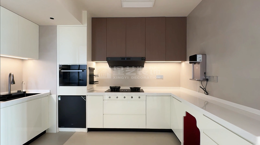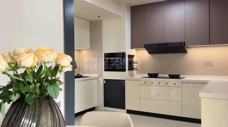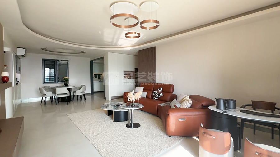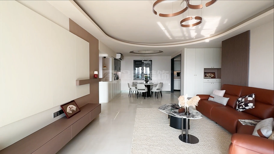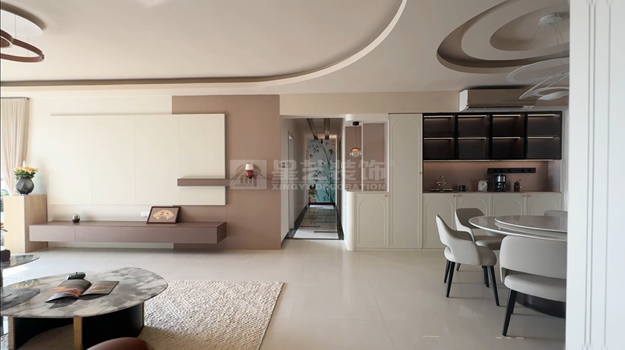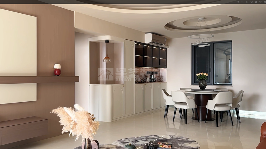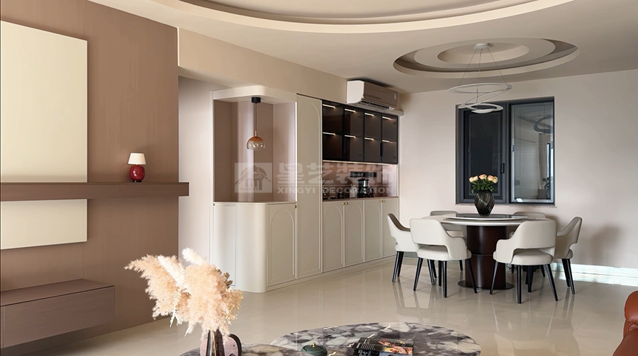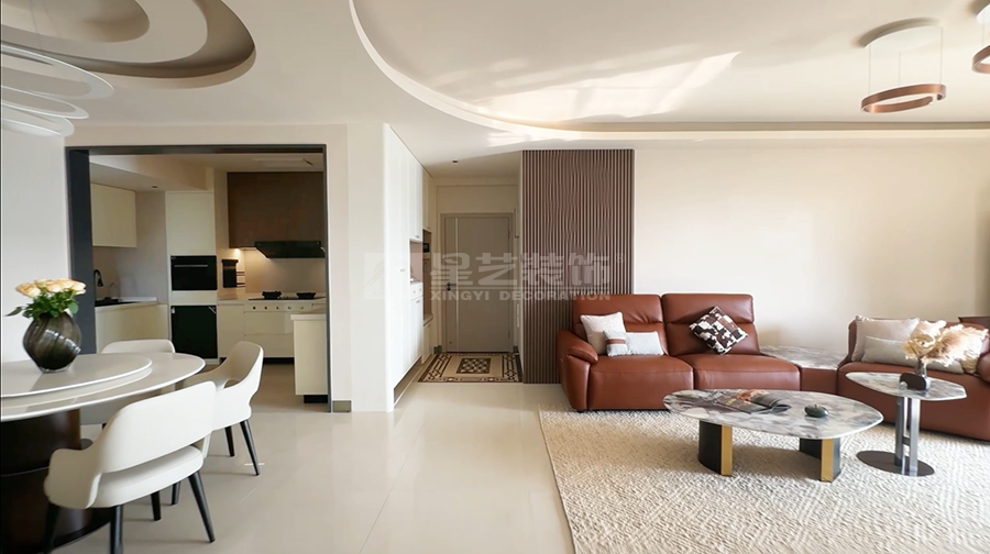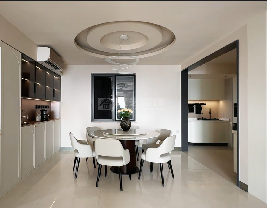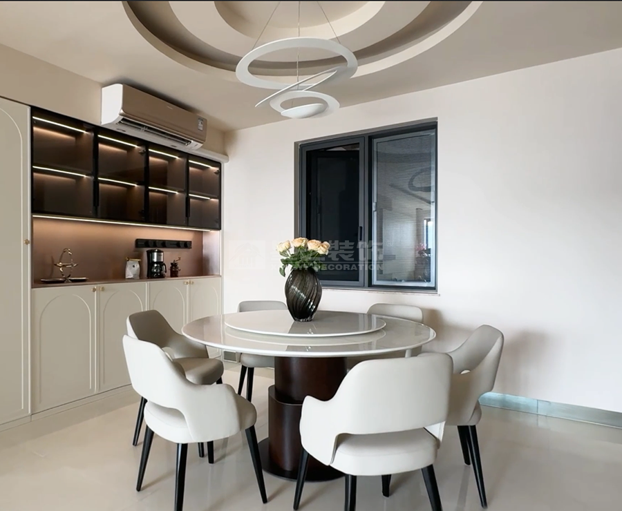 本案以现代风格为核心,打造客餐厨一体的通透空间。客厅浅色大理石茶几配米色地毯,弧形吊顶柔化边界;餐厅圆形餐桌围合六把白椅,餐边柜黑玻门藏巧思,多圆环吊灯点睛。厨房L型布局,白色和木纹色撞色橱柜利落实用。整体以浅调为基,红花瓶、竹纹墙背景墙等细节点缀,刚柔并济,营造温馨而不失格调的现代生活场景,满足了一家子三代同堂的居住需求。