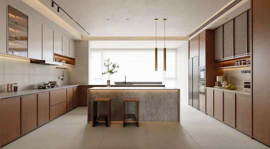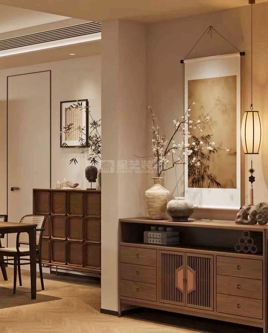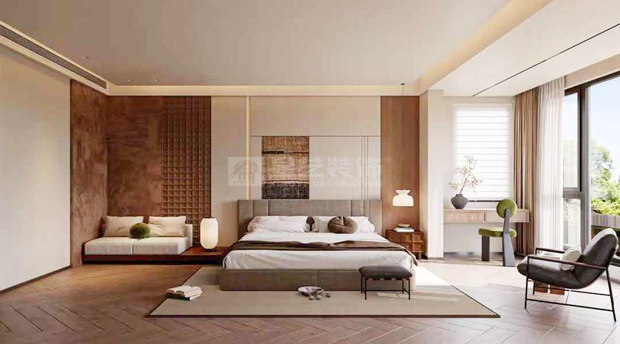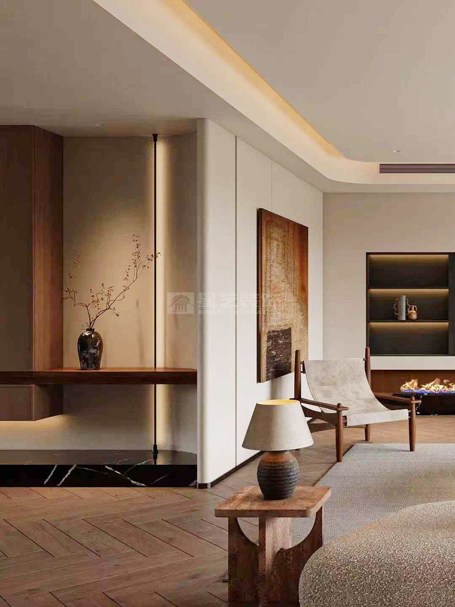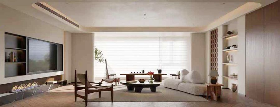 这是一个现代宋式美学客厅设计,以“留白、自然、雅致”为核心,融合宋代美学“清雅内敛”意境与现代简约设计语言。 色调与材质:主色调为米色、浅棕色等大地色系,墙面采用米白色乳胶漆与浅棕色木饰面拼接,地面为浅色实木地板;电视背景墙为竖条纹肌理木饰面,搭配浅灰色软包床头板,沙发与单人椅采用亚麻或棉麻材质。 空间布局:开放式布局,客餐厅一体化;电视墙采用“无主灯+嵌入式收纳”设计,地面隐藏式地暖;窗边设矮榻与飘窗柜,形成独立休闲区。