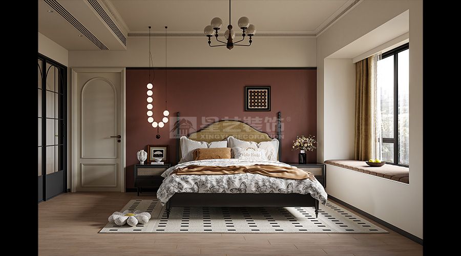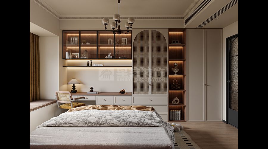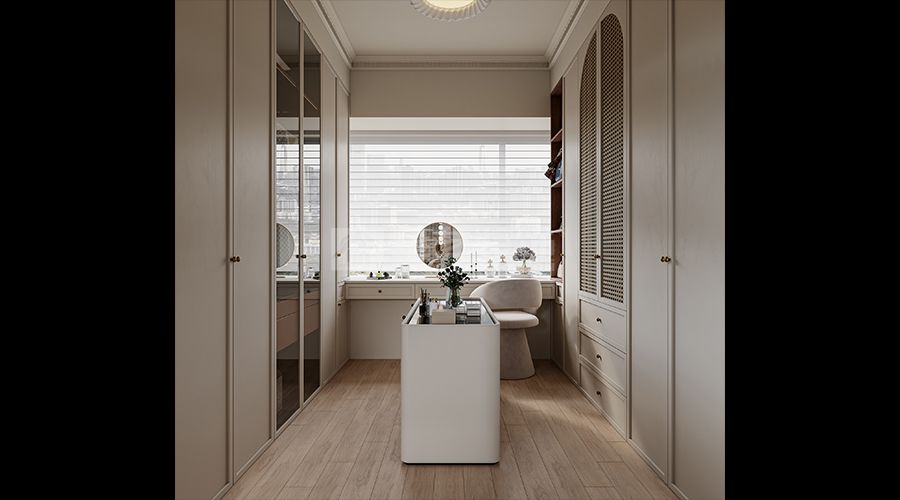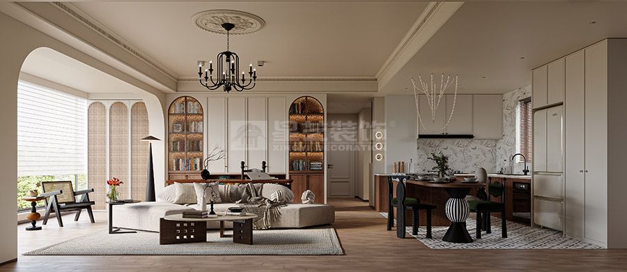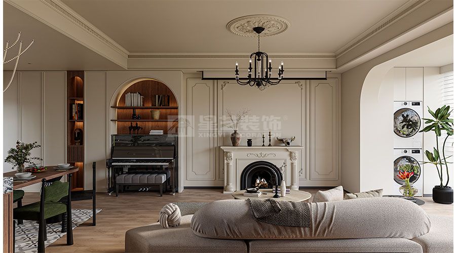 色调以奶油白和胡桃木色为主,点缀法式壁炉及线条元素,营造出舒适松弛的法式中古风。